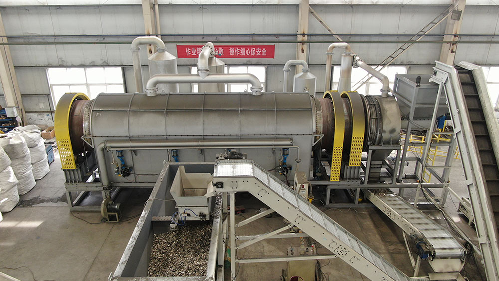 工作流程也很簡單:預(yù)熱啟動(dòng)(達(dá)到300℃后可利用漆層炭化熱量)→ 破碎后的易拉罐連續(xù)入爐→ 依次經(jīng)歷預(yù)熱烘干、漆層熱解、炭化分離→ 可燃?xì)怏w回收燃燒→ 水冷降溫→ 連續(xù)排出脫漆鋁片,全程密閉,既安全又高效,單臺(tái)設(shè)備每小時(shí)可處理300-2500kg易拉罐碎片。
